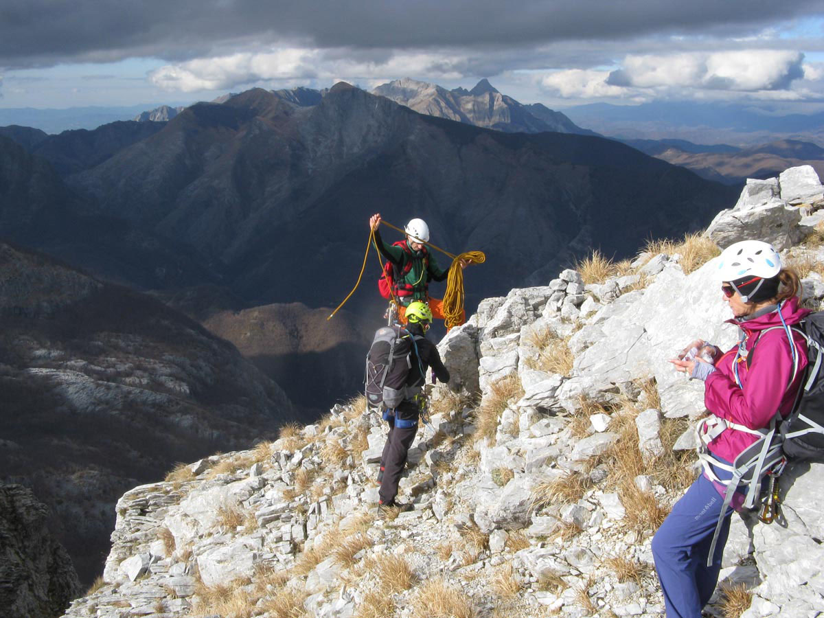 Man mano che saliamo il sentiero diventa più roccioso e poco prima di affrontare una parete un poco più verticale ci attreziamo con il materiale alpinistico quindi aggiriamo un torrione sulla sinistra e risalendo in cima troviamo una catena di sosta con anello da cui ci caliamo in corda doppia per scendere ad una sella dove rifacciamo le corde.![]()