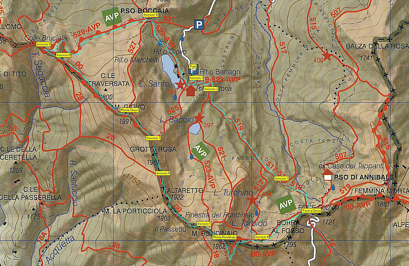 Note : si tratta di un panoramicissimo percorso ad anello, sicuramente la salita al Monte Rondinaio ed il tratto che da quest'ultimo conduce al Monte Giovo è riservato ad escursionisti esperti, si possono fare comunque facili escursioni partendo sempre dal Lago Santo che offriranno a chiunque la possibilità di godere di un magnifico ambiente.