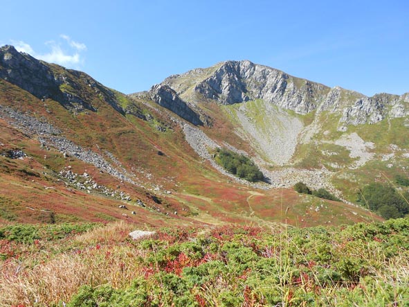 L'aria è fresca e, come spesso succede nei pressi delle foci, soffia un bel vento, dobbiamo coprirci prima di soffermarci ad ammirare il versante lucchese dove poco distante si sviluppa l'Orrido di Botri, siamo ormai fuori dal bosco e la vista può spaziare, il terreno è ricoperto letteralmente dalle piante di mirtilli e qualche felce, i colori predominanti sono il rosso con tante sfumature, qualche macchia di verde ed i punti blu' dei piccoli frutti. ![]()