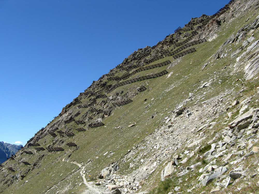 Riempiamo le borracce e quindi, lasciandoci gli impianti da sci sulla destra, riprendiamo la salita sempre su sfasciumi in direzione sud; l’Allalin davanti a noi è sempre più vicino ! dopo una mezz’ora incontriamo un sentiero (bivio 2) a zigzag che scende a Saas Grund, ma che tralasciamo, intanto sulle nostre teste i paravalanghe sembrano spartiti musicali, adesso il sentiero piega verso est e scende nell’Almagellertal (valle dell’Almageller) dove alle 17,30 arriviamo stanchi al rifugio Almagelleralp a quota 2.200 metri.